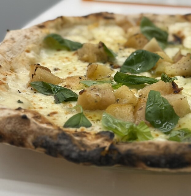 クアトロフォルマッジにりんごをトッピングをしたピッツァを焼いていただいた。