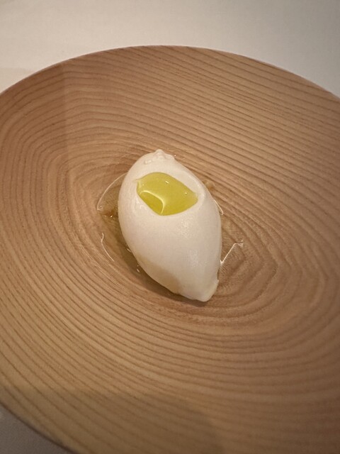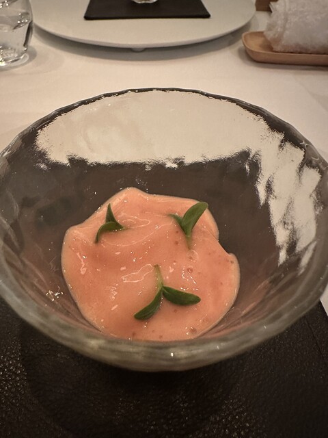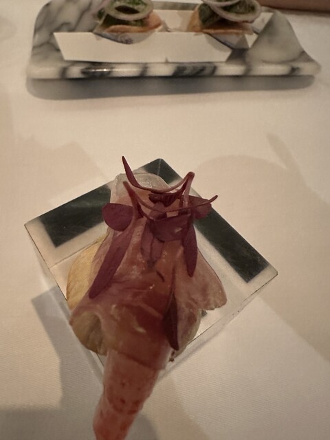 スペイン(バルセロナ)は昨年家族でもいって楽しかった、旨かったので その後せがまれ ではと予約して伺いました スナック これがムースを小さく三ヶにまとめ 作ってから数分以内に食べないと崩れてしまう繊細な料理 これとイカスミの揚げパン 中には温かいソースが 最初から凄い 三種のタパスはシマエビ、イワシ、イクラが最高 高揚します 厚岸の牡蠣、フォアグラ、そして帆立と続きます