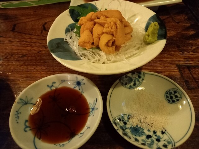 「生うに」には、醤油と焼塩が出され、山葵と焼塩のコラボは秀逸で酒が進みます。