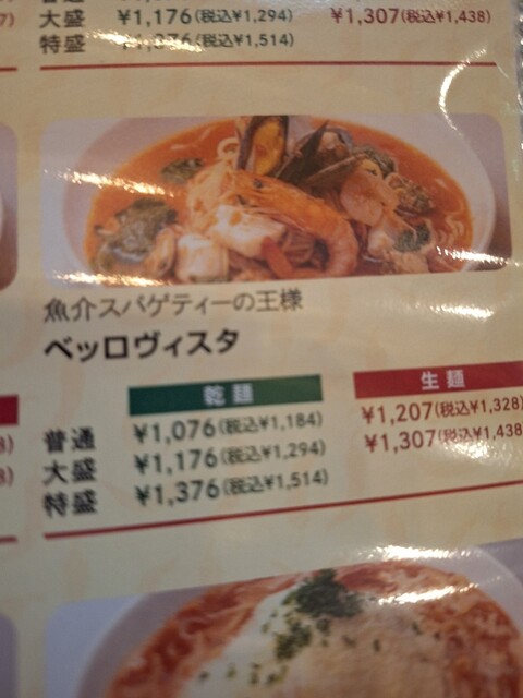 「ベッロヴィスタ」は海鮮たっぷりのトマトソースベースのパスタで、海老、ムール貝、貝柱、にバジルソースも少しかかっていたかな。