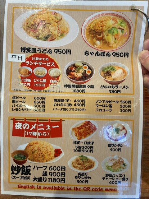看板メニューは、自家製の極太麺を使用した「皿うどん」と「ちゃんぽん」です。特に皿うどんは、もちもちした太麺の食感が特徴で、長崎の細麺とは一味違う美味しさだと評判です。コクのあるスープに多彩な調味料を加えて味の変化を楽しむこともできます。