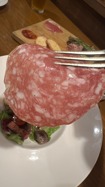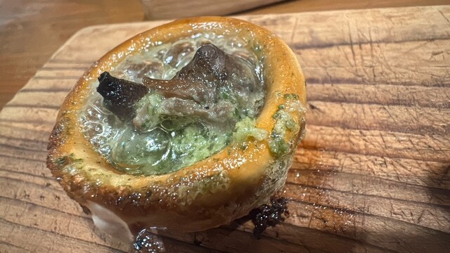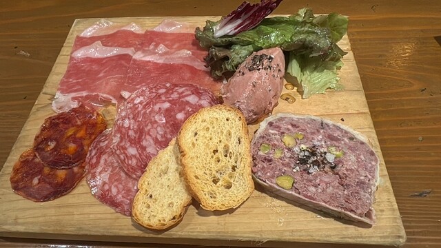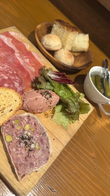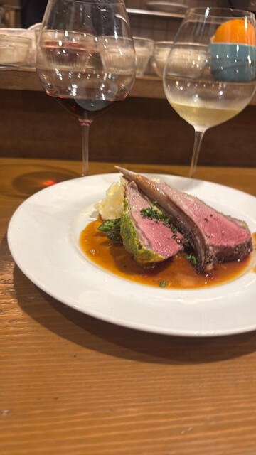 まずはローベンブロイの生ビール。冷えたグラスと泡のバランスが見事で、最初の一口からテンションが上がる。前菜に選んだシャルキュトリーの盛り合わせは、リエットやサラミ、パテまで一つ一つが丁寧な仕事。バゲットとの相性も抜群。エスカルゴの香草バター焼きは香り高く、フランスそのもの。仔羊のロティは火入れ完璧で、添えられたソースとの調和も見事。さらに黒トリュフの牛ホホ肉赤ワイン煮は圧巻で、ねっとり濃厚なソースとマッシュポテトが絶妙。