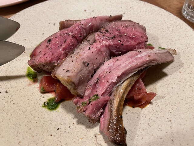 もうちょっと火を入れても美味しいでしょうけど、手づかみで食べたくなるようなプリミティブな快楽はレアであってこそ。でも、まあ、もうちょっと焼いてもいいと思うけど。