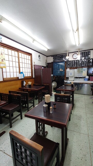 暖簾は出ているものの、準備中の札に営業中看板が店内。