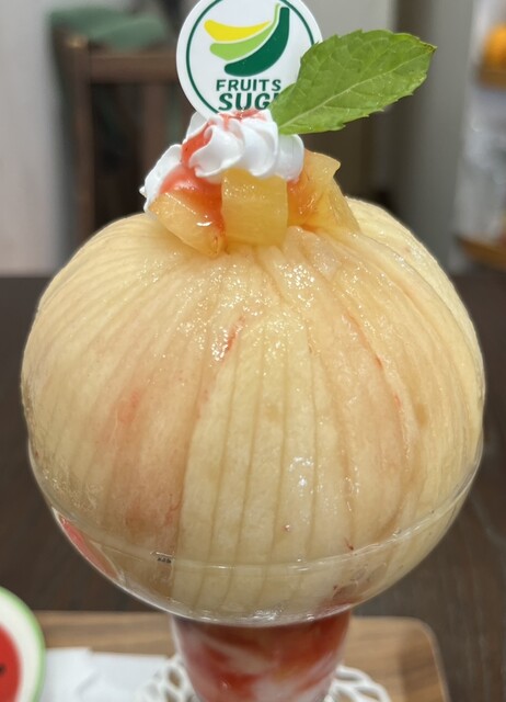 綺麗に薄切りされた桃が丸ごとグラスの上に乗っています。トップには生クリームとプラム。桃の酸味はほんのずか、甘みしっかり。柔らかすぎず硬すぎず、絶妙な歯応え。