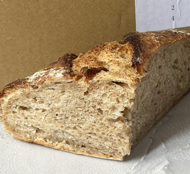 →クラストはカリサクッと、クラムはびよーんと伸びてもっちりむっちり。思っていた以上に塩気の方が強めでシンプルに小麦粉と酵母の風味が味わえるパン!