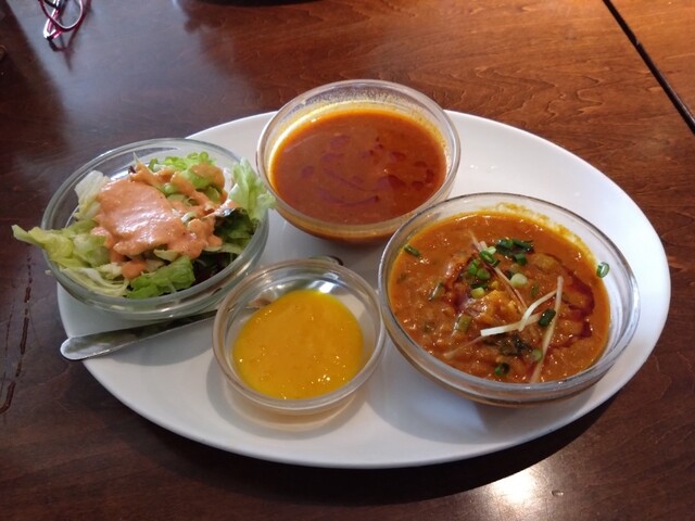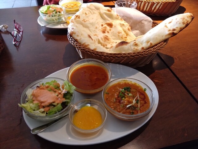 カレーが二種類選べてサラダ、ナン、デザートが付いて1000円以下というコスパ。