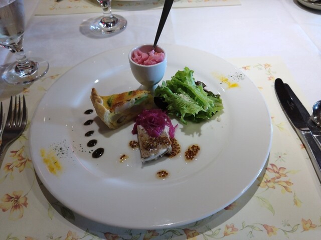 オードブル、自家製パン、ポタージュ(長ねぎとビーツ)、メイン料理(牛のステーキ)、自家製ケーキ(苺とメロンのショートケーキを選択)、コーヒー。