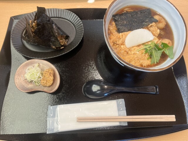 奥久慈卵の卵とじ蕎麦とあられおにぎりを頂きました!美味しかったです!
