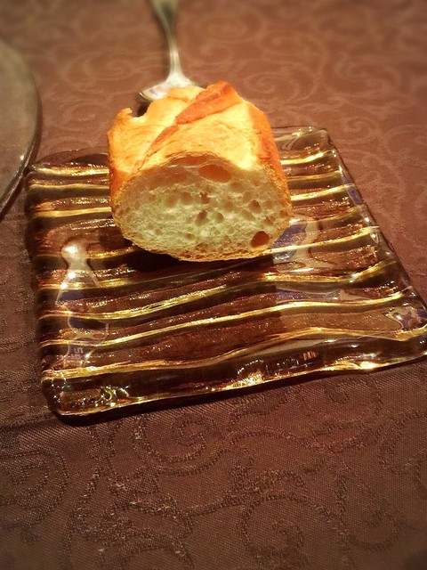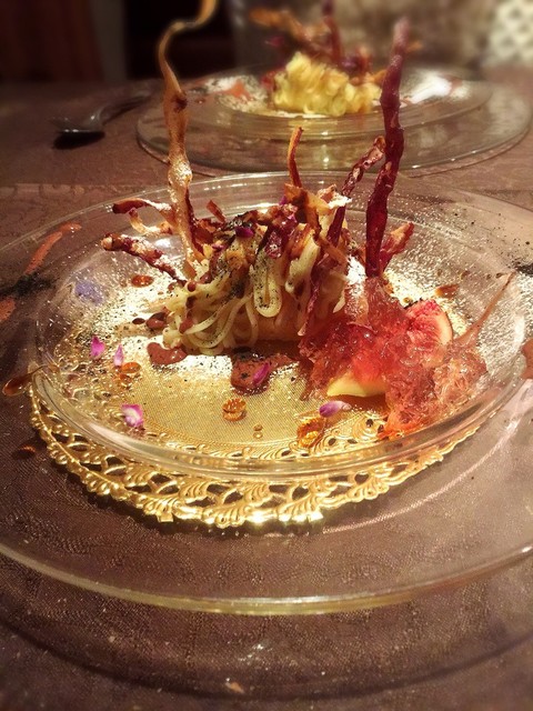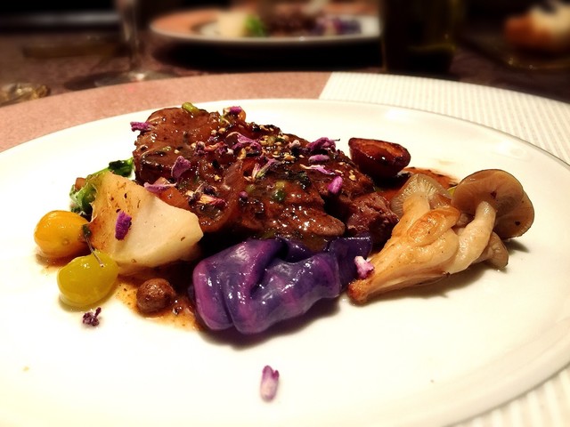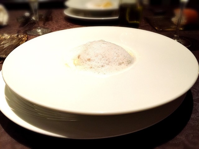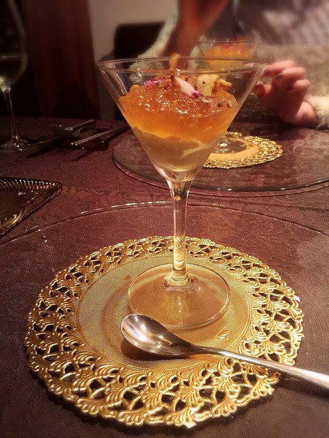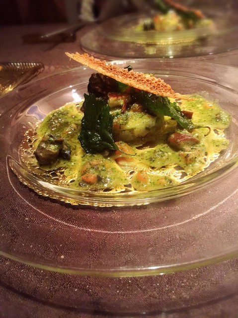 ムースの様な濃厚なヴルーテを、コンソメジュレとカリカリに素揚げした栗と共に食べる。