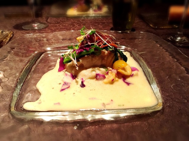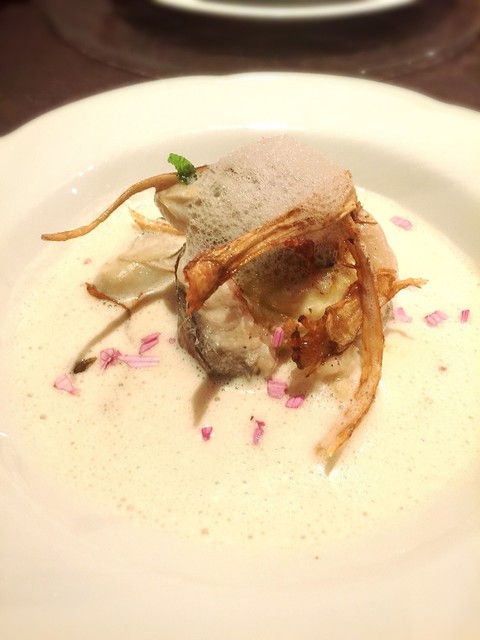 カサゴが巻かれたムースの下にはマッシュポテト、それとスープの中に牡蠣が2つ。
