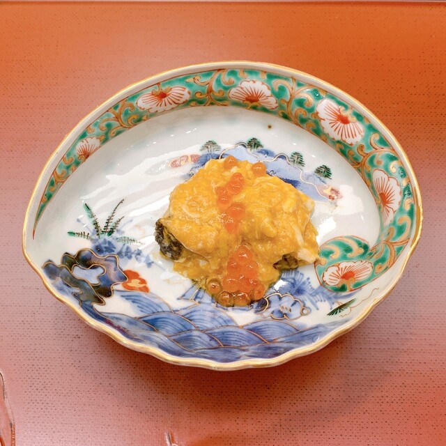 ・新潟佐渡の黒アワビ オースワン 金にらオムレツ 明治時代のアワビの形のお皿 ※ねっとり上品な風味と濃い風味の黒アワビで最高美味✨