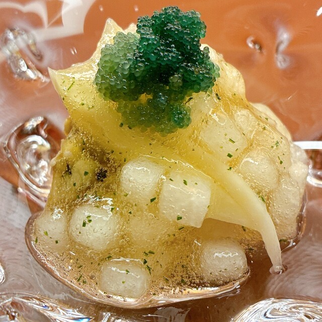・黒あわび ぶんたん ジュレ 雲丹 そら豆 ※それぞれの風味が繊細で最高美味✨