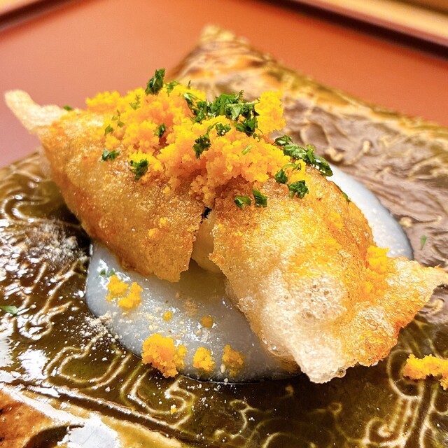 ・子持ち鮎 春巻き ※スイカのタレと鮎の苦味をあえて出していてフレッシュかつ芳醇で極上美味✨