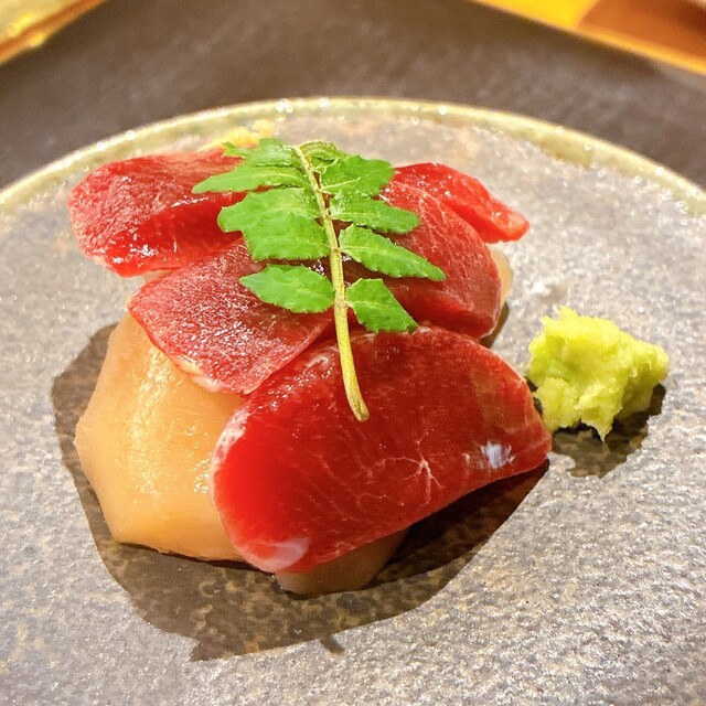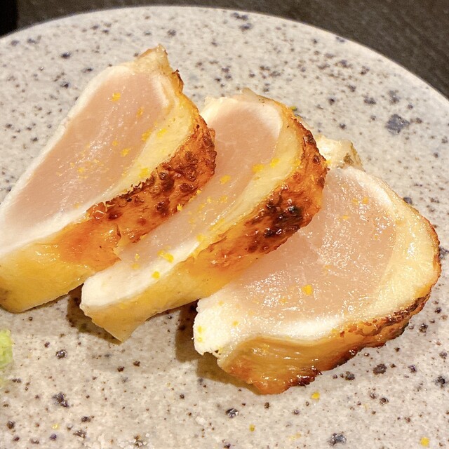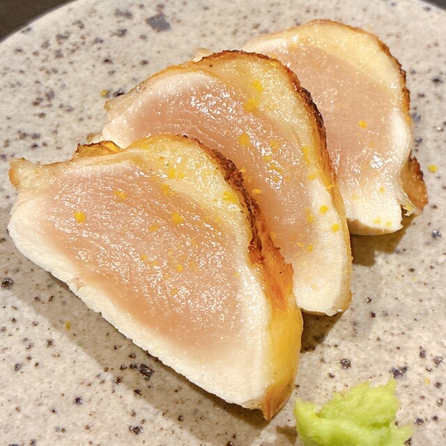 ・滋賀 淡海地鶏 むね たたき 広島もしお 柚子皮 ※とても甘くて炭火の香りと共に中は刺身レアで極上美味✨焼いてから冷やしてるそう♪