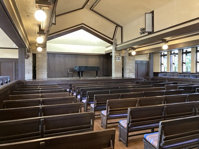 フランク・ロイド・ライトの設計により建設された重要文化財でありながら「使いながらの保存、いわゆる“動態保存”を意図して様々な用途に貸出を行っており、結婚式や撮影会、各種イベントなどにも使われています」とのこと。