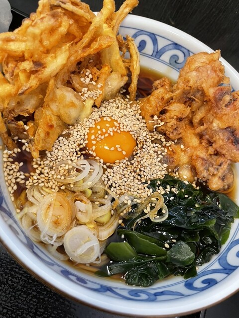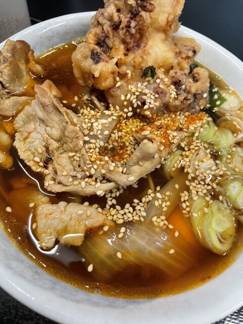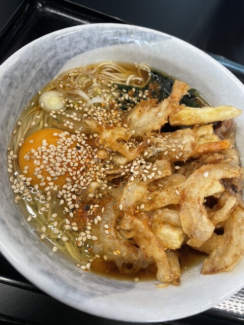 みのがさの肉そばげそ天卵は、まず出汁の力強さが印象的。甘辛く煮られた肉の旨味がつゆに溶け込み、コクが一段と深まる。げそ天は衣が香ばしく、中はぷりっと柔らかで食べ応え抜群。卵黄を崩すとまろやかさが加わり、味の変化も楽しい。わかめや玉ねぎ、胡麻の風味も全体をまとめ、最後まで飽きずに啜れる満足度の高い一杯。