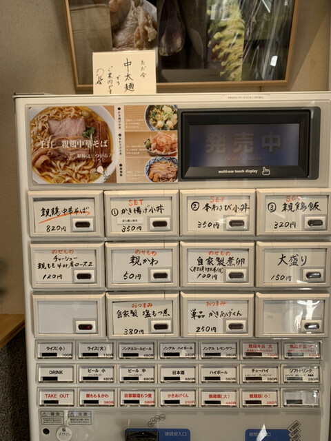 入店し、券売機で親鶏中華そば、煮卵、それに親かわ をポチポチポチと