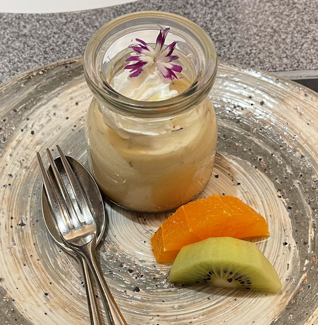 デザートは嬉野紅茶のプリン、撫子の花が添えてあります。紅茶の香りがほのかにする、柔らかプリン、コーヒー紅茶にあいます。