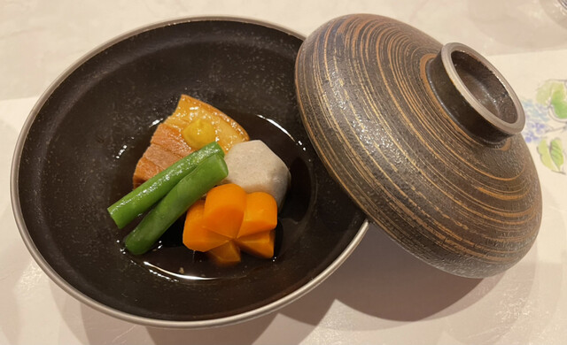 驚いたのは前菜の一品です。一口で終わる量ですが、市松模様の何かがあって、チーズと何かが薄い昆布で巻かれていました。ものすごく美味しかったんです。母と妹が、干し柿だろうと言っていて、チーズと干し柿の市松模様のアレを、もう一度食べてみたいと思いました。初めて口にする一品でした。