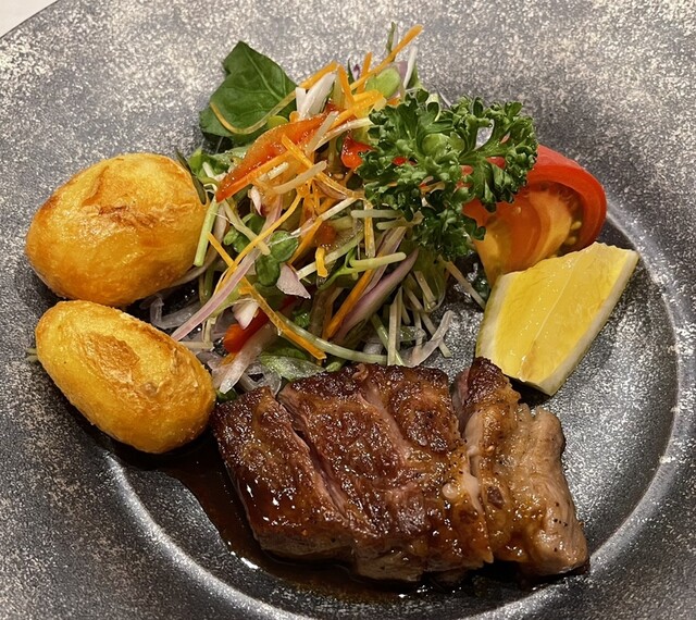 そのあとにはステーキです。お野菜シャキシャキの柔らかジューシーなステーキです。つけ添えのポテトも美味しい。