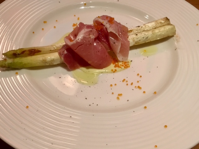 「ホワイトアスパラの炭火焼き生ハムのせ」