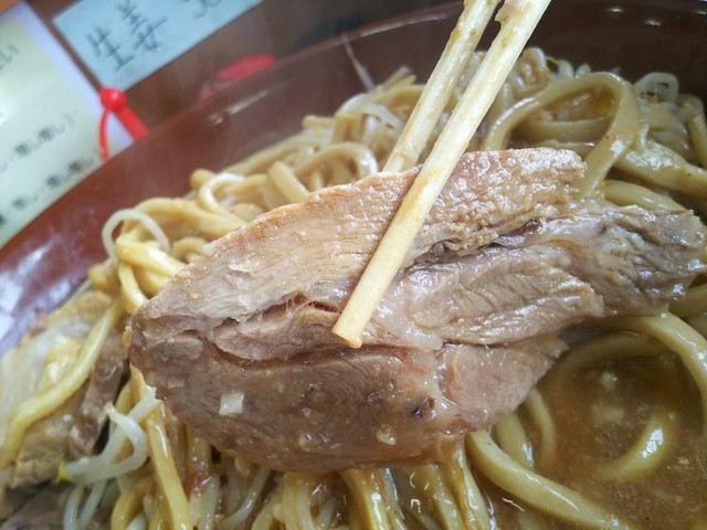 若干とろみのあるまろやかな濃厚スープで、ストレートの極太麺にこれでもかと絡みつき、すばらしいと思いました。