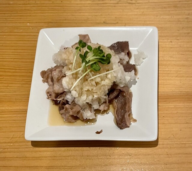 ここの牛ポン美味しいです。牛バラ肉に大根の鬼おろしとポン酢を絡めているのですが、大根の辛味も無く美味しいポン酢が爽やかで絶品です。