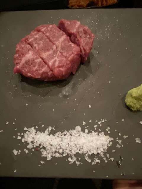 お任せコースと、サガリ、特選ロース、おにぎり、キムチ、ウーロン茶2杯、頼んで全部で18500円✨