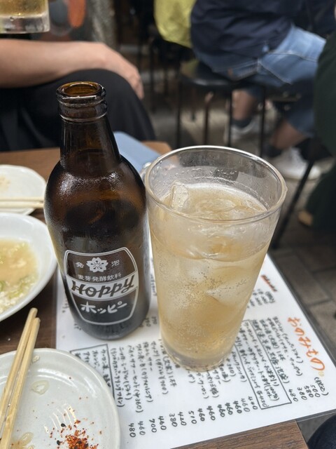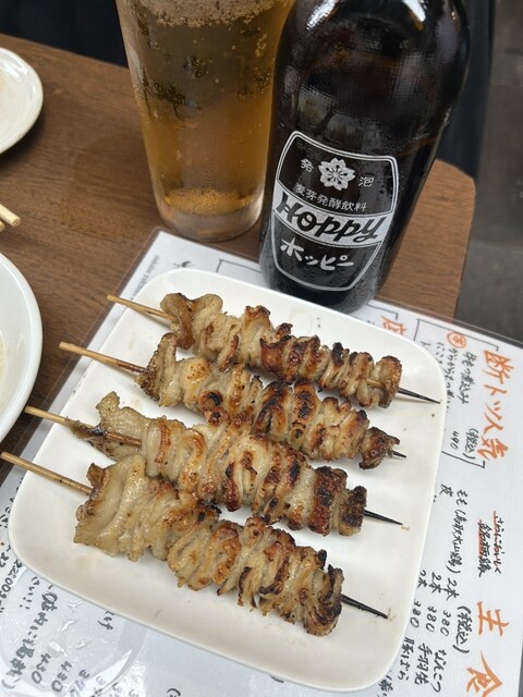 この店のホッピーは、ホッピーセット1に対してホッピー(中)は4回飲めてシッカリ酔えるコスパの良さ。そしてツマミは、おススメの煮込み豆腐と美味しいやきとりを塩で。写真は撮り忘れましたが鯖塩焼きやマグロブツなどの魚料理までなんでも美味い。
