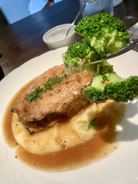 豚肉の外側は香ばしく焼き上げでありますが、ナイフを入れると中は絶妙な火加減でとても柔らかく、ソースの味も格別で口の中が半端ない幸福感で満たされます✨さらに肉の下にはマッシュポテトが敷いてあり、これにソースが染み込んでウマウマです♪