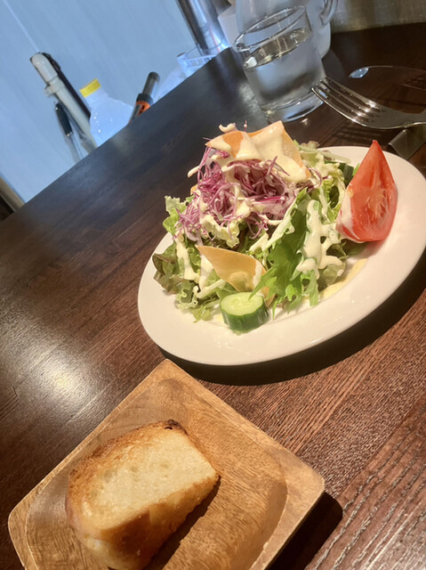 次はサラダとフォカッチャが登場。パンはお代わりできるみたいです。