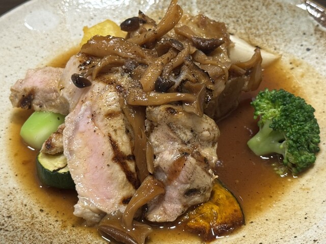 越後豚のローストと牛バラ肉の煮込みがまさかの一皿に同居。