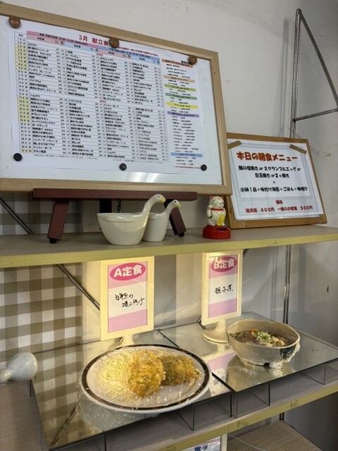 一般夜の定食A600円税込を注文。この日は白身魚のフライでした。カウンター越しに受け取ります。ご飯大盛りもサービスです。