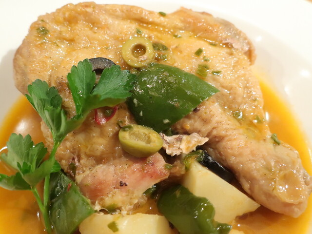 鶏もも肉のチリンドロン「骨付き鶏もも肉とジャガイモ、ピーマンのトマト煮込み」※メニュー表記通り
