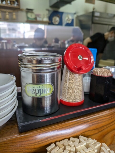 卓上には胡椒、白胡麻、味塩、爪楊枝