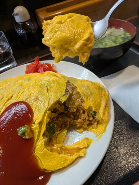 結構時間が掛かって30分位して着丼❗4人目に入店したのですが…まぁこれはこれで良しとして、味は…卵は普通にケチャップライスを包んでいるのですが、言葉で表せない感覚…ケチャップライスはケチャップと塩胡椒だけでなくコンソメが入ってる様な深い味わい❗