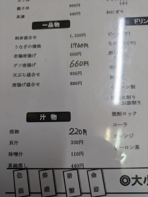 一品料理から酢牡蠣400円と鯨のオバイケ450円(小学生低学年の時以来、久しぶりに食す)