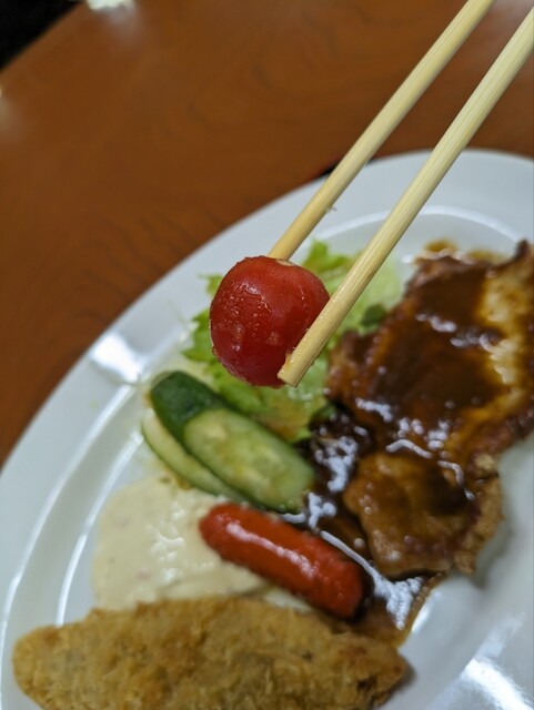 メインのお皿にデミグラスソースが掛かった豚テキと赤色のウインナー、白身魚のフライ、サラダがオンしてます。