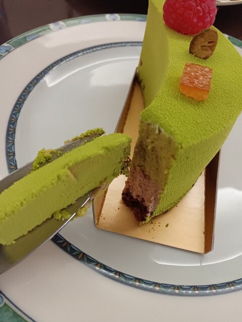 ピスタチオとチョコレートのムースが層になっていて中にラズベリークリーム