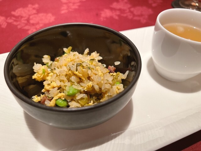 メインディッシュの「信州牛ヒレ肉と彩り野菜 XOオイスターソース添え」では、信州牛の柔らかな食感と濃厚なXOソースの相性が抜群で、箸が止まりません。さらに、「焼き鮭と生海老の炒飯」は、シンプルながらも素材の味が活きた締めにふさわしい料理でした。