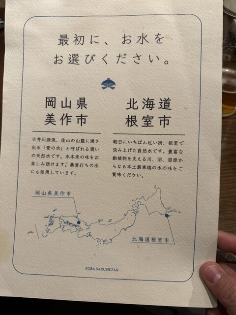到着するとまず目に入るのが、飲み水を「岡山県美作市」と「北海道根室市」から選べるという独自のサービス。それぞれの地域の自然水を味わえるのは特別感があり、一杯目の水から始まるおもてなしに感動しました。このような細部へのこだわりが、料理への期待感を高めます。