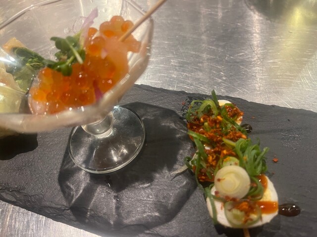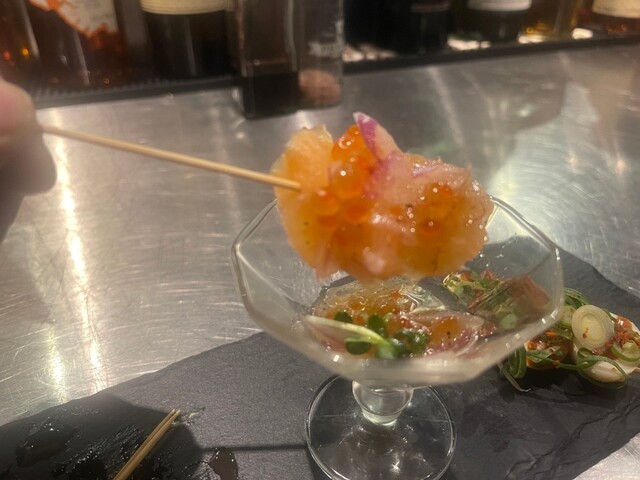 冷前菜が串スタイルで提供されます。これは初めての体験。