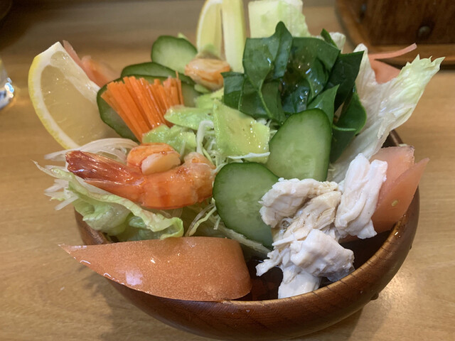サラダとパスタのランチは、山盛りサラダが最高!よくある葉っぱのサラダではなく、焼き野菜やピクルスが葉っぱの下に隠れていて、上にはポ...