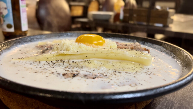 そして新メニューという事で、一枚麺のカルボナーラをオーダー。