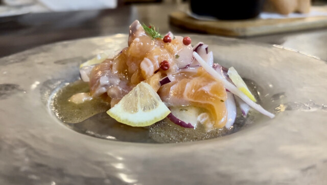 料理はサーモンのマリネ、しらすのアヒージョから。