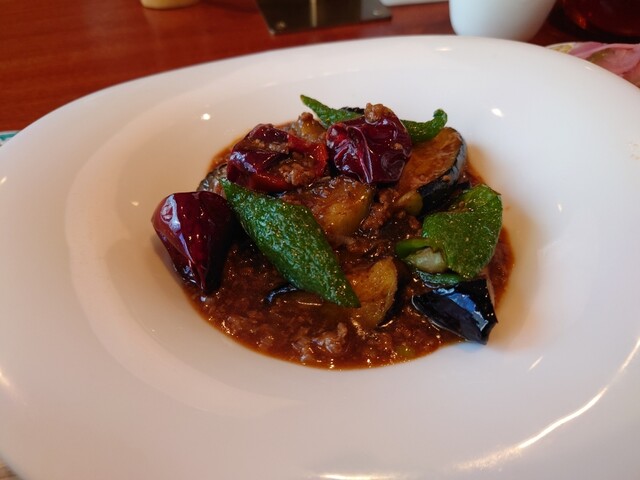 茄子がとろっとろで餡が絶妙に旨い。大きな赤唐辛子がごろっと3個入っています。程よいピリ辛感。