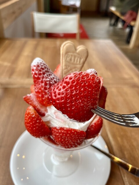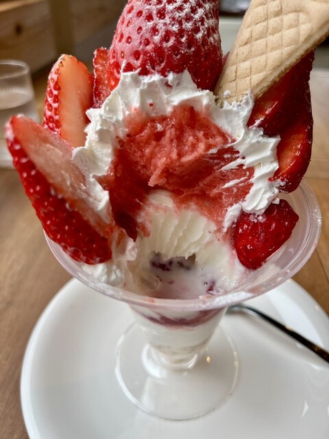 食べ始めるのにワクワク!フォークを入れて一口、うーん幸せ〜!美味しい!真っ赤ないちご、採れたてを感じるみずみずしさ、甘さもすっぱさもあって、3拍子揃ったいちごパフェです。ジェラートや生クリームも入ってどこを取っても美味しかったです♪