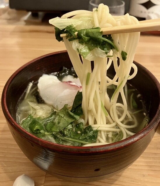 鯛塩ラーメン✨️ これまた絶品!✨️呑んだ後でも癒しの新鮮な鯛の切り身を乗せたあっさり塩出汁ラーメンが堪らない✩⋆*॰¨̮⋆。˚✨️2人でシェアする旨、お伝えすると1人ずつ素敵なレンゲ付きで提供(๑ᵒ̴̶̷͈᷄ᗨᵒ̴̶̷͈᷅)و