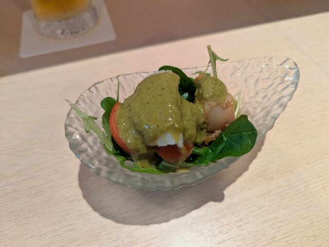 「燻しホタテとイカのサラダ春菊ドレッシング」